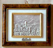 Quadretto raffigurante Castelmonte eseguito a sbalzo su peltro con bagno argento, disponibile in diverse misure. |